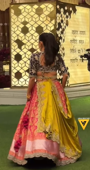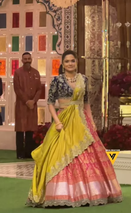However, Radhika's sister, Anjali Merchant's look at the event left us awestruck. For her sister's haldi ceremony, Anjali Merchant slipped into a mult-hued regal lehenga set. She paired it with a blue-toned choli with intricate silver work all over. The Banarasi skirt was set in the hues of orange and pink. Anjali teamed her ensemble with a mustard-toned dupatta.