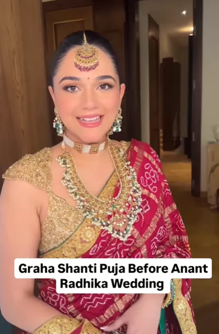 For the griha shanti puja that the Merchant family hosted at their abode, Radhika's sister, Anjali, wore a red-hued Gharchola saree paired with a unique golden-embellished blouse. She accessorised her ensemble with a Guttapusalu necklace, a pearl choker, a broad maang teeka, a matching pair of earrings attached with a hair accessory, and a pair of bangles.