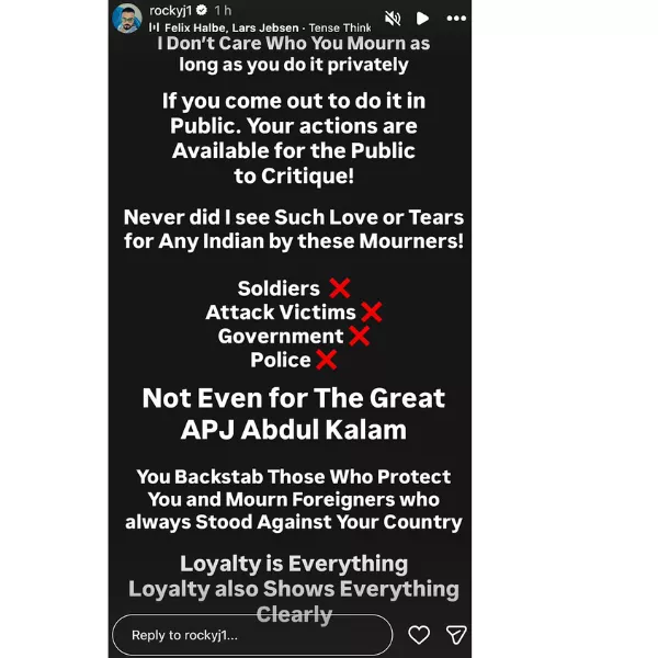 "Never did I see such love or tears for any Indian by these mourners! Soldiers, attack victims, government police, not even for the great APJ Abdul Kalam. You backstab those who protect you and mourn foreigners who always stood against your country. Loyalty is everything. Loyalty also shows everything clearly."