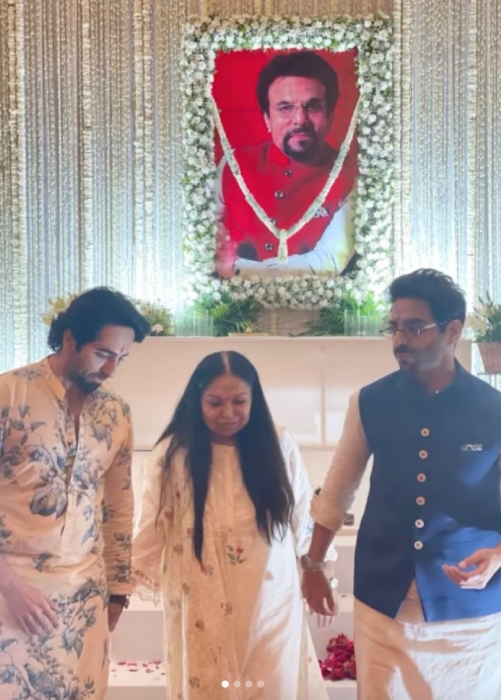 On May 25, 2023, Ayushmann took to his Instagram handle and posted a couple of pictures from his late father, P. Khurana's prayer meet. In the first picture, Ayushmann Khurrana and his brother, Aparshakti Khurana were seen helping their mother as she looked inconsolable. The next photo was of their late father, P. Khurana's, which was decorated with flowers.