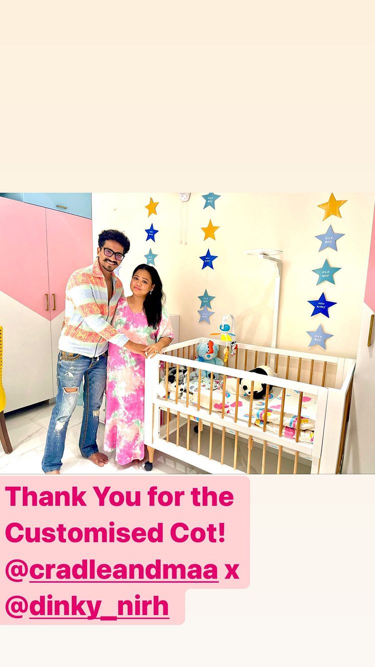On May 4, 2022, Bharti took to her Instagram handle and shared a cutesy IG story with her hubby, Haarsh. Her picture gave a glimpse of her newborn son's nursery. It featured a cute white-coloured cot, which was decorated with a colourful rainbow-themed bedspread, and a soft toys. The couple looked adorable as they posed next to their son's cot. The price of this cot from Cradle and Ma is Rs. 31,500.