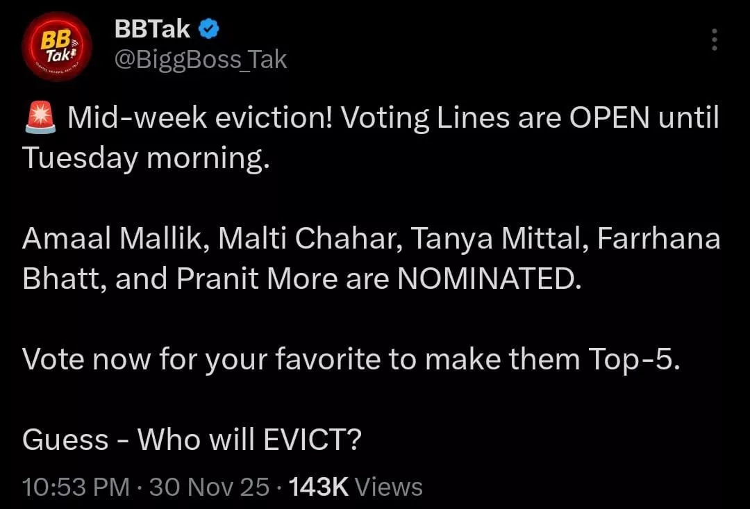 The last Weekend ka Vaar of Bigg Boss Season 19 was filled with twists and turns. Ashnoor Kaur was removed from the show on the November 29, 2025 episode, due to her alleged violence towards fellow contestant, Tanya Mittal. The next day, Amaal bid a tearful goodbye to his best friend on the show, Shehbaz. The double eviction came as a complete surprise to viewers. Now, the Salman Khan-hosted show is gearing up with another twist, according to the Bigg Boss insider, @BiggBoss_Tak. According to the X (formerly Twitter) account, there will be mid-week evictions following Ashnoor and Shehbaz's exit.