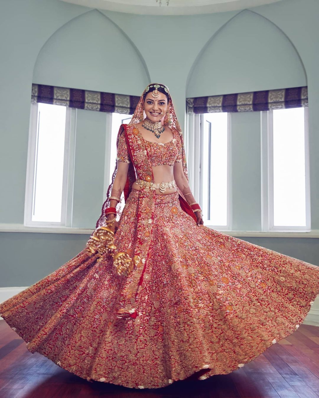 "Kajal's lehenga is a labour of love. An intricate zardosi embroidered floral pattern that took 20 people almost a month to create." In an interview with the Vogue, Kajal Aggarwal had revealed the details of her look and was quoted as saying, "The Kashmiri resham work was so intricate that it look like I draped a shawl around me. I wore uncut diamond jewellery by Sunita Shekhawat, and some heirloom pieces [matha patti and nath] from my mother and nani. My chooda came from Amritsar, and Mrinalini Chandra personalised my kalire with charms of swans, love locks and more."