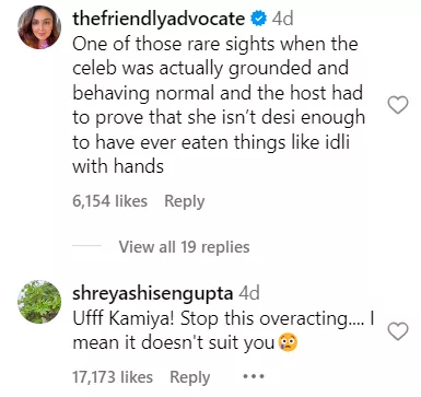 This particular segment from the whole interview was posted by Curly Tales on their Instagram page. Netizens took note of Kamiya's remarks and some of them started calling her out for the same. One user said, "She doesn’t know idli with chicken curry, who gave her Aadhaar card." Another wrote, "It was one of those rare sights when the celeb was actually grounded and behaving normal, and the host had to prove that she isn’t desi enough to have ever eaten things like idli with hands."