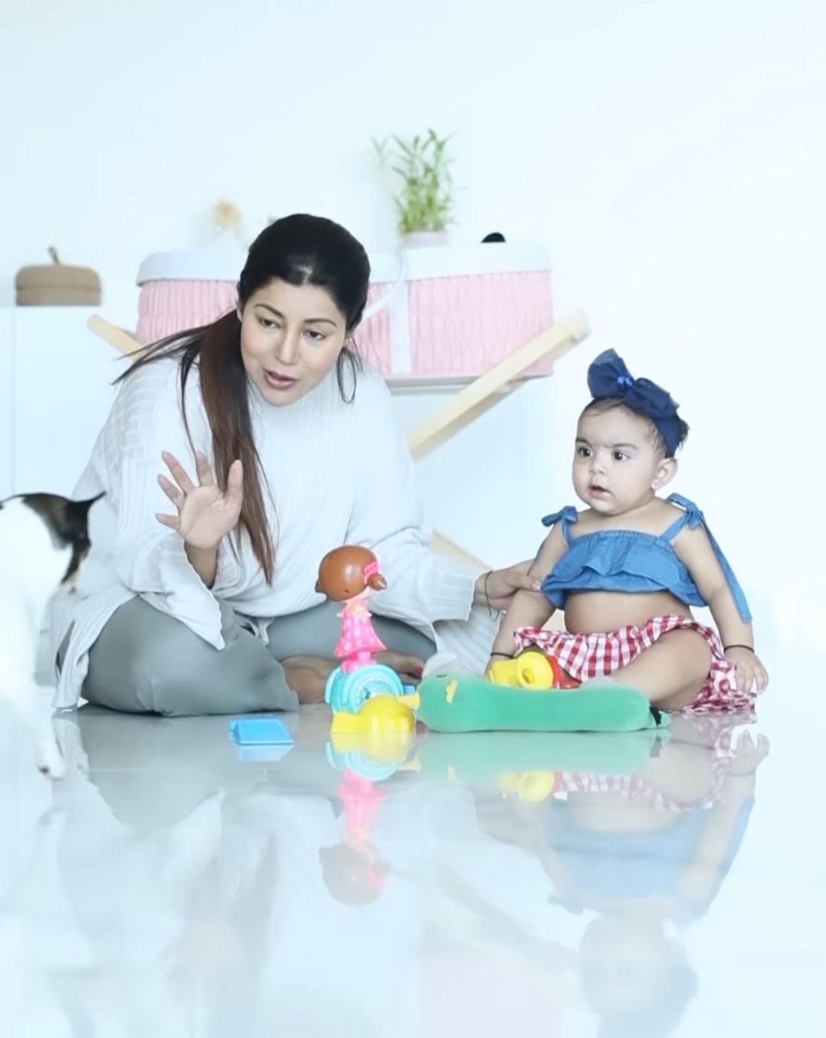 In the next segment of the video, Debina can be seen sitting with her firstborn, Lianna on the floor next to the bassinet. The doting mommy can be seen interacting with Lianna and making her laugh. Soon, their furry pet, Pablo joins them and being a hands-on mommy, Debina handles him as well. She threw a ball for Pablo to fetch, which Lianna found quite amusing. Lianna looked cute as a button in a blue-hued crop top, red and white checkered skirt and a blue headband. Sharing the video, Debina penned: