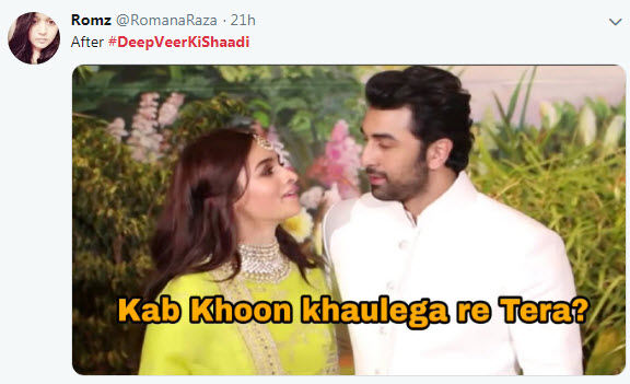 Can’t stop laughing, right? Ever since the ravishing newly-weds posted the first-ever pictures from their wedding, netizens couldn’t keep calm! Innumerous fans posted hilarious memes of Deepika and Ranveer which will make you go all ‘rolling on the floor’ with laughter! In case you need to set your weekend mood straight, take a look at some of the memes dedicated to DeepVeer below: (Also Read: Katrina Kaif Wishes Deepika Padukone On Her Wedding, Though She Was Dropped Out Of The Guest List)