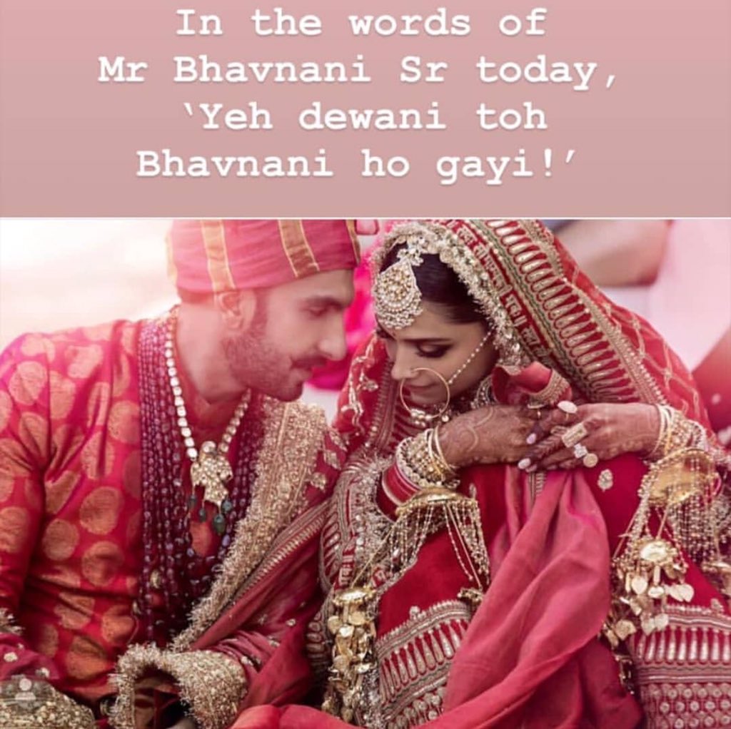 November 14-15, 2018 came and went by and we still hadn’t caught a glimpse at DeepVeer’s picture, until yesterday evening (November 15, 2018). Sharing two stupendous pictures, Deepika and Ranveer nailed it in their Sabyasachi apparels and looked heavenly. Isn’t it? Celebrity hair stylist, Nitasha Gaurav revealed the first words that Ranveer Singh's father, Jagjit Singh Bhavnani said to his bahu immediately after the wedding. As per an Instagram story posted by Nitasha, the golden words that came out of Bhavnani Senior's mouth were, “Ye Deewani to Bhavnani ho gayi!”, which she wrote atop DeepVeer's wedding picture. Here, take a look at the same: