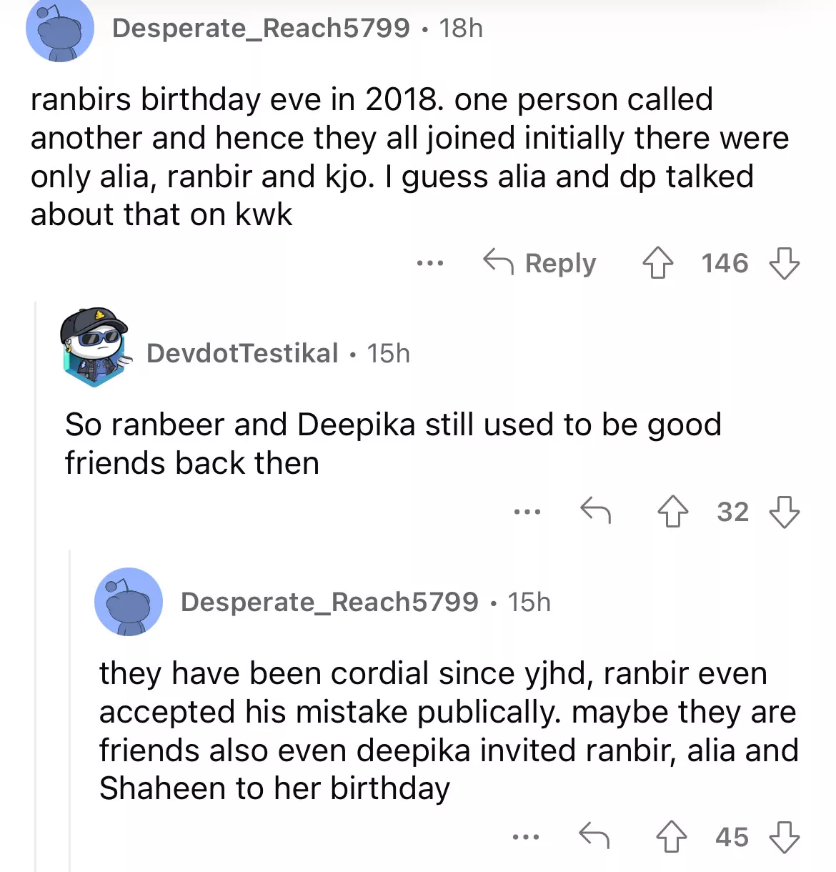 As soon as the picture surfaced online, netizens were in awe of Ranbir and Deepika's camaraderie. They took to the post's comment section and reacted to the same. One user commented, "So Ranbir and Deepika still used to be good friends back then." Another wrote, "Raised a lot of eyebrows back then in 2018." Meanwhile, a third user penned, "I didn't realise Ranveer Singh is also there in the picture!"