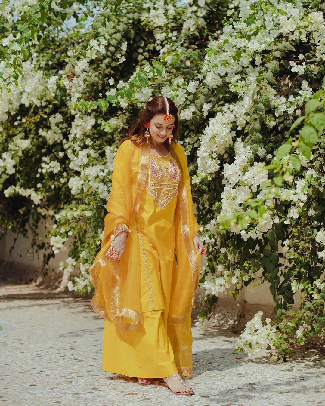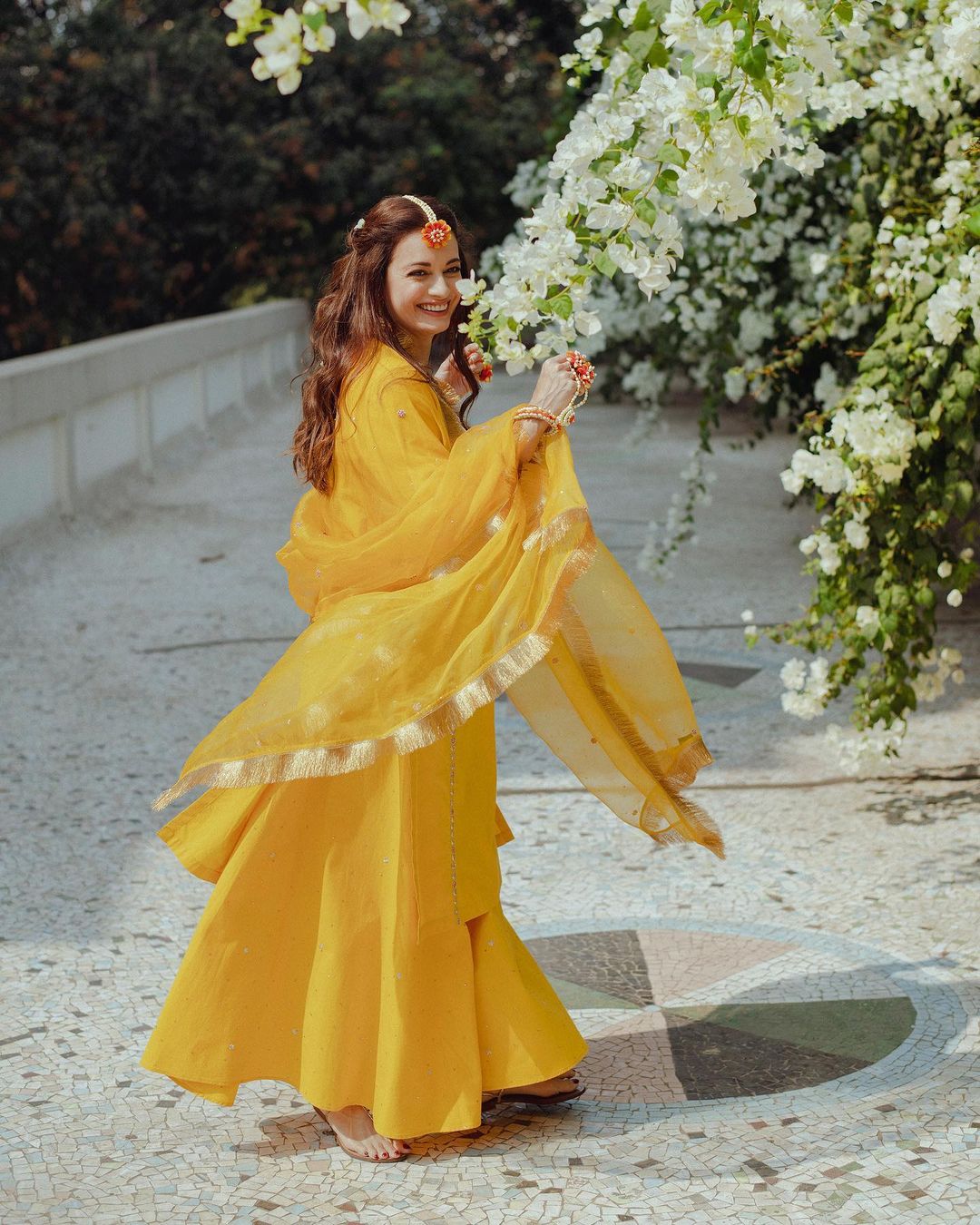 On February 24, 2021, Dia took to her Instagram handle and shared glimpses of her mehendi ceremony. In the pictures, Dia radiated glow in a bright yellow ensemble with kiran border in her dupatta. Her look was completed with floral jewellery and her brightest smile. Alongside the picture, she wrote, "Sunshine sunshine #Sunsetkedivane." Check it out below: