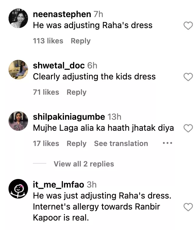 A user commented, "Ranbir Alia ko kese ignore kar raha hai bro." While another fan wrote, "He was adjusting Raha's dress." Another netizen penned, "Mujhe Laga alia ka haath jhatak diya." Another Ranbir fan said, "He was just adjusting Raha's dress. Internet's allergy towards Ranbir Kapoor is real."