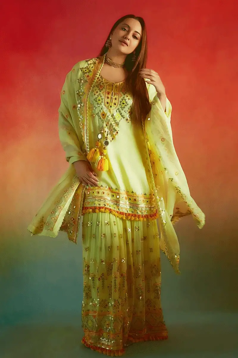 For the owners of the inverted triangle-shaped body types, the best tip for you is to opt for something very minimal in the upper portion and pair it up with something that is flared and flowy at the bottom. Try to keep the neckline wide but deep necklines, off-shoulders, and sleeveless should be avoided. Keep the dupatta tucked in one shoulder so that it gives a leaner effect on the upper portion.