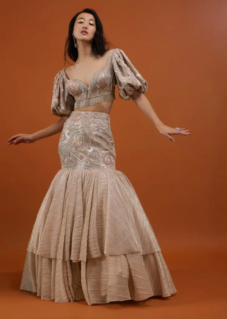 Talking about the rectangular-shaped body type, the best fit for you is to opt for flared bottoms. Make it balanced out and opt for a lehenga skirt that has a lot of layers, ruffles, and pleats. The best combination of these lehengas is short choli for the rectangular-shaped body type, and try to volumise the upper portion with a unique drape style.