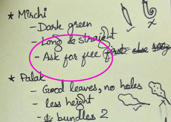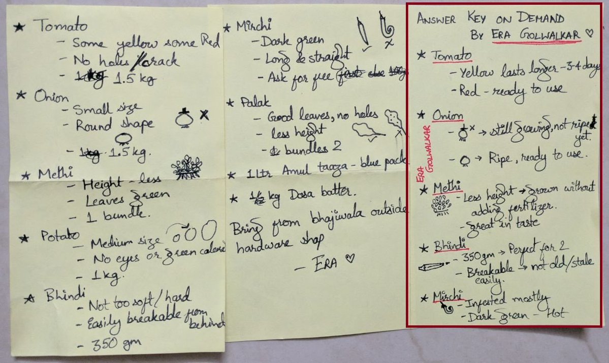 Wondering how? Well, what Era did was that she sent her husband along with a list of vegetables. And the list had all the illustrations, diagrams, quantity checks, everything! Even for that matter, she made diagrams as to what the size of tomatoes should be, how should the onions be, and so on. This is what she gave to her husband: