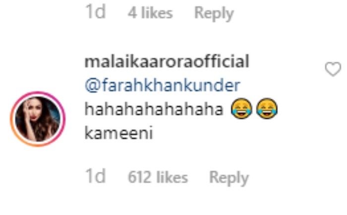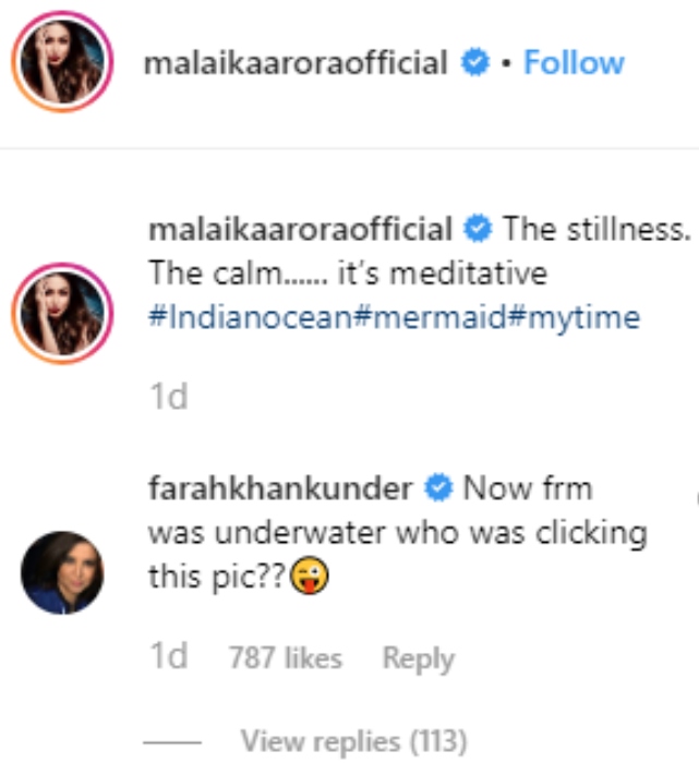 While we couldn’t stop drooling over the awesome click and Malaika, her close Bollywood pal and director, Farah Khan made an interesting observation and commented, “Now from was underwater who was clicking this pic??”. This definitely left Malaika in splits as quickly replied, “hahahahahahahaha kameeni.” These pictures are from Malika’s recent Maldives vacation with her girlies and beau, Arjun Kapoor and it was also assumed to be her bachelorette trip. Check out the funny conversation below: