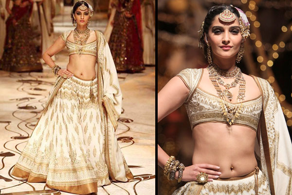 This golden-cream lehenga worn by Sonam Kapoor is a complete stunner. Off–white and cream are considered the most sophisticated, yet subtle colours for the Indian bridal lehengas, and we can clearly see why! This particular design by Rohit Bal speaks volumes for itself and the colour.