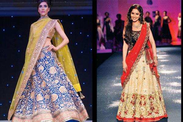 A lightly embroidered blouse and dupatta with a heavily decorated bridal lehenga looks amazing as well. Also, a well-fitted choli with a heavy embroidered lehenga is amongst the best options that a bride could wear on her special day. Patterned kalis held in place with a heavy border and a matching dupatta will surely alleviate the bride’s look on her day.