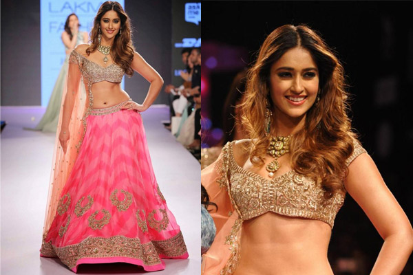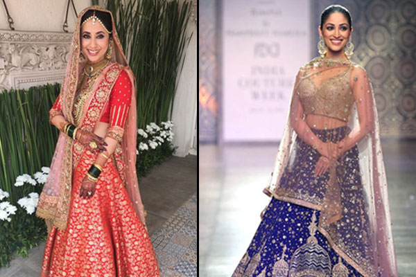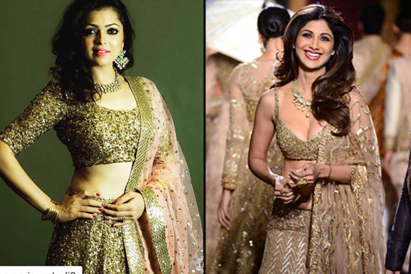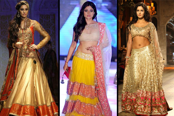 The fabulous golden lehenga with multiple layers looks elegant with embroidery in the same tone. The hem can be stitched in darker shades to maintain the balance. The golden lehenga can also be teamed with zari work or gota work with fine threads in same or contrasting tones. Swarovski crystal work or zardozi work can accentuate your golden lehenga and take it to an all-new level. You can take a cue for your look with this Rimple and Harpreet Narula piece worn by Shilpa Shetty.