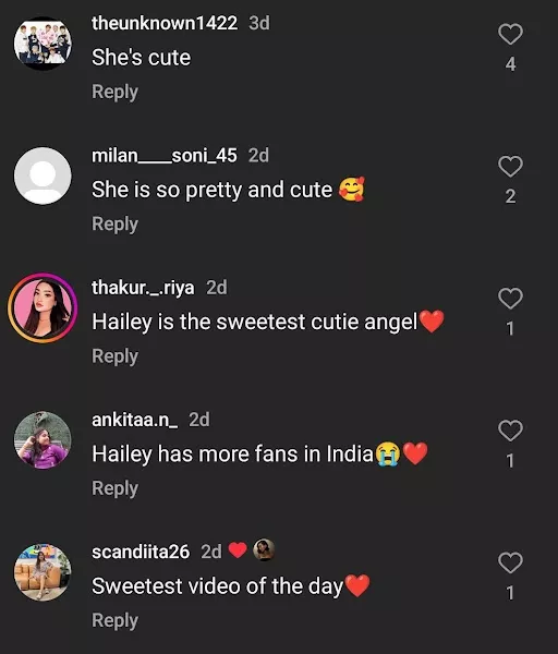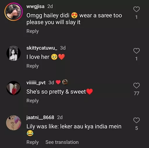 The video went viral soon after its release, and netizens were mighty impressed with Hailey dancing to the beats of a Bollywood song. Some were even proud of Lilly for being a stan of her Indian roots and promoting the culture wherever she goes. Some even urged Hailey to visit India and wear a saree. Check out the comments of the netizens: