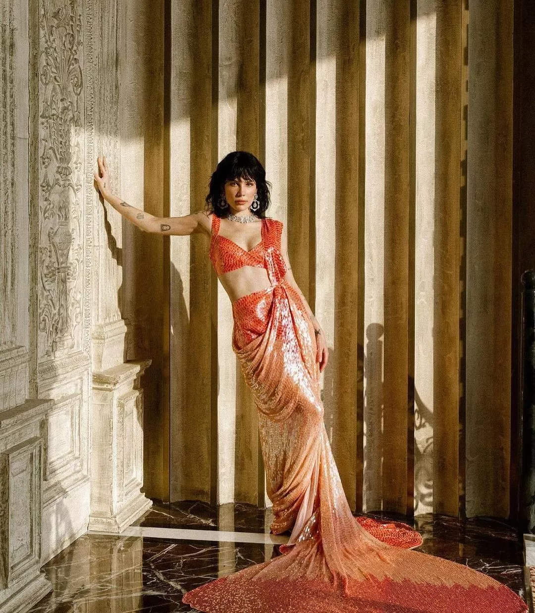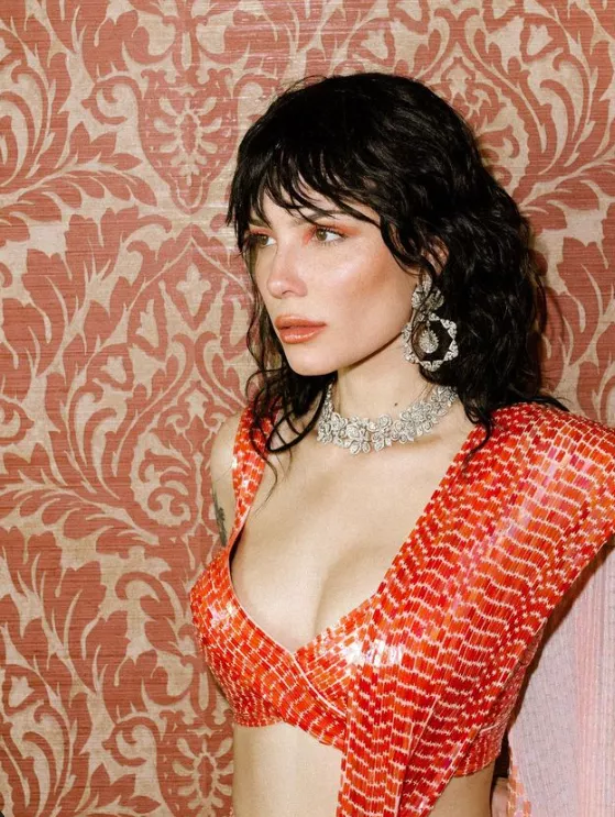 Halsey wore an ombre coral-hued sculpted saree, which was adorned with mosaic sequins, and a blouse of the same print. She paired her look with jewellery from Manish Malhotra High Jewellery. Halsey chose a diamond hexagon drop pair of earrings and a statement necklace to complete her outfit. She opted for bright makeup featuring orange eyeshadow, heavily highlighted cheeks, and orange-hued lipstick, and kept her tresses open.