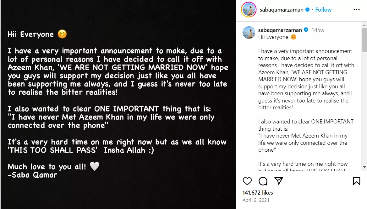 It was also reported that Saba Qamar was in a relationship with the Pakistani actor, Hamza Ali Abbasi in 2014. However, the two never confirmed or denied the rumours. Lastly, the Hindi Medium actress was all set to tie the knot with Azeem Khan, a blogger and entrepreneur in 2021. However, later it was called off after the latter was accused of sexual harassment by a woman.