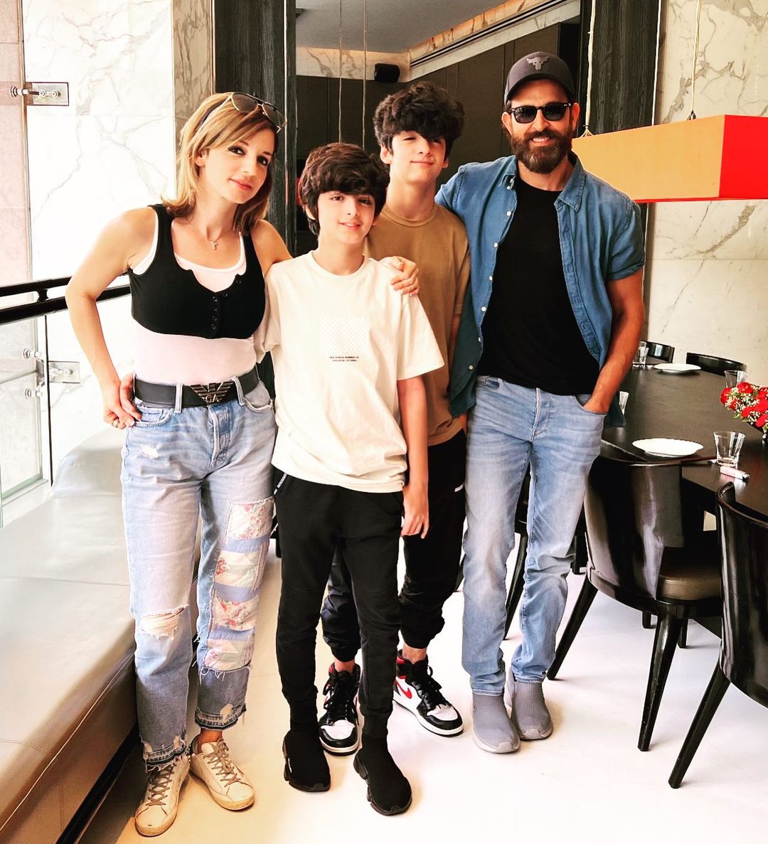 On May 1, 2022, Hrithik Roshan and his ex-wife, Sussanne Khan's elder son, Hridhaan Roshan turned a year older. And to celebrate Hridhaan's birthday, his doting parents and sibling, Hrehaan Roshan were spotted outside a restaurant in Mumbai reportedly for lunch together. In the glimpses shared by the paparazzi, Hrithik was seen wearing a black T-shirt paired with a denim shirt, denim pants, a pair of sunglasses, a cap and sneakers. Birthday boy, Hridhaan and his brother, Hrehaan was seen wearing comfy T-shirts paired with black pants and sneakers. On the other hand, their mommy, Sussanne looked gorgeous in a white top paired with a black bralette and denim pants. Check out: