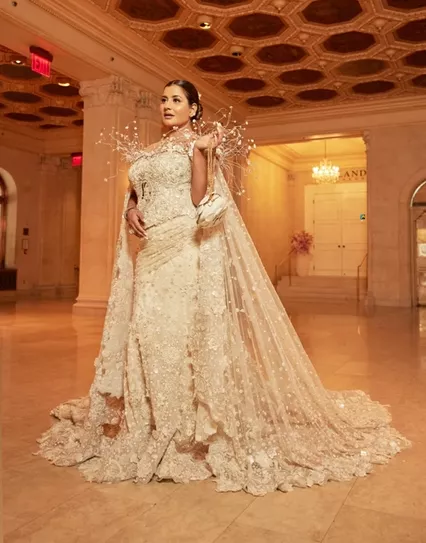 For her second appearance at the Met Gala on May 6, 2024, businesswoman, Sudha Reddy walked the red carpet in a custom-made Tarun Tahiliani ensemble. The bespoke Tarun Tahliani outfit captured the ephemeral essence of time and beauty, as per the designer. It showed the emasculation of colonialism to a renaissance of tradition infused with modernity and craft with technology. Her stunning ensemble has intricate floral patterns all over it, and it featured a corset-style top attached to a body-hugging skirt and a long sheer cape at the back. It took 80 artisans and 4500 hours to make her ensemble.