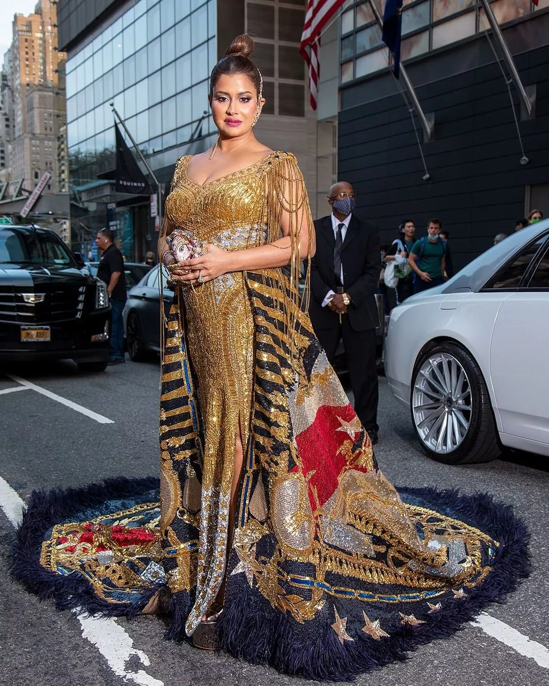 For her debut at the Met Gala 2021, Sudha opted for a Falguni Shane Peacock gown that was inspired by the American flag, to reflect that year's theme - ‘American Independence'. The ensemble featured a bright gold sculptured gown with 3D embellishments of Swarovski crystals, sequins and bugle beads along with a dramatic 4-meter metallic train that sported colours of the American flag. Styled by Ise White, Sudha completed her look with a pair of sequined gold stilettos from Chanel, a Judith Leiber Ganesha clutch and Farah Khan Ali's ornate diamond earcuffss. Altogether, she looked priceless.