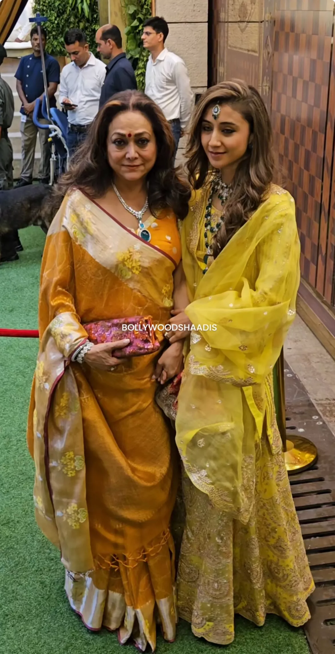 Before the event, Tina was papped along with her daughter-in-law, Khrisha Shah. Tina was decked up in a mustard-hued saree with a broad golden border and beautiful yellow floral prints. She teamed her drape with a yellow blouse featuring silver embroidery. Tina Ambani later called her daughter-in-law, Khrisha Shah, to pose with her for the paps. Khrisha looked stunning in a bright yellow-hued lehenga with heavy golden embroidery on it. She teamed her look with a matching blouse and sheer dupatta.