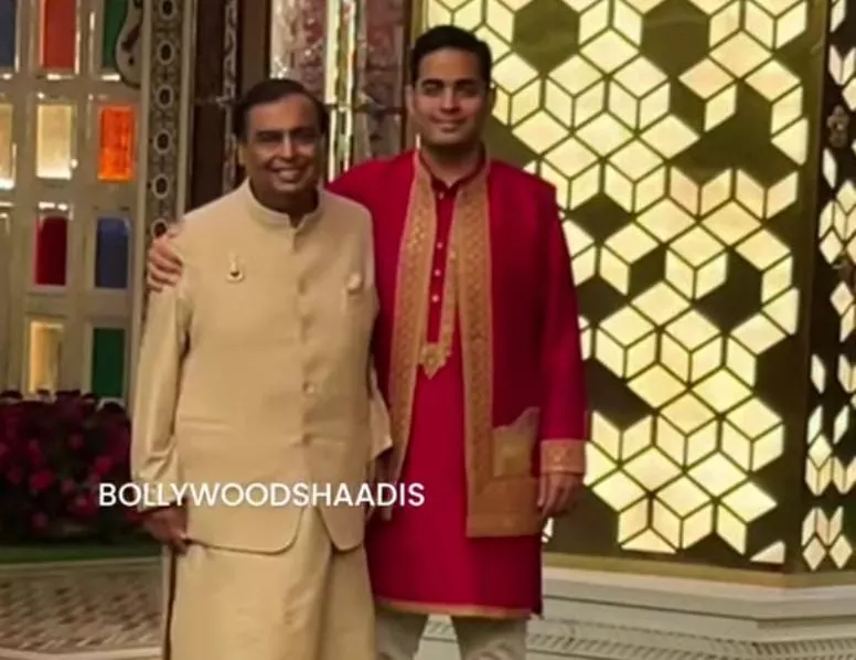 Mukesh Ambani and Akash Ambani were papped outside Antilia as the father-son duo posed happily for the paps. Akash looked handsome in a red-hued kurta with golden work at the borders. Mukesh, on the other hand, opted for a beige-toned kurta-pyjama set. Mukesh’s sister, Deepti Salgaoncar, was also present at the pre-wedding event. For the day, Deepti dolled up in a red-hued saree with silver work all over and floral borders.
