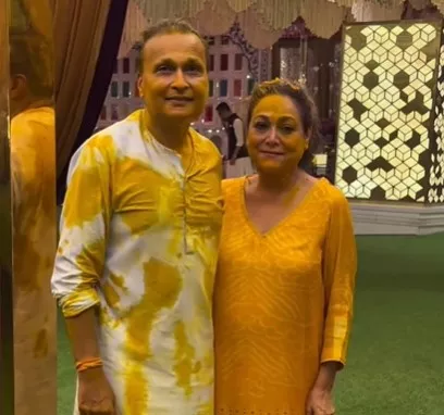 Anant Ambani’s chacha and chachi, Anil Ambani, and Tina Ambani were seen getting out of Antilia after the haldi ceremony. Before heading into their car, the couple stopped and posed happily for the paps while being drenched in haldi. Anil donned a white kurta and pyjama, while Tina wore a yellow-coloured co-ord set.