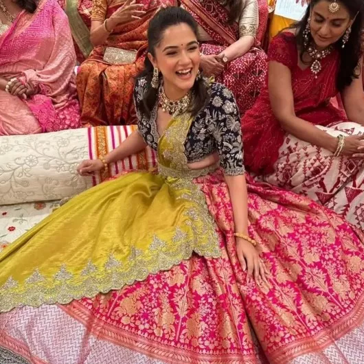 On the other hand, Radhika Merchant’s sister, Anjali Merchant, stunned in a blue-hued embellished choli, teamed it with a pink and orange-toned lehenga. She added a yellow-hued dupatta to complete her look. With a sleek ponytail and soft makeup, Anjali complemented her attire with a statement choker, a pair of earrings, and kadas.