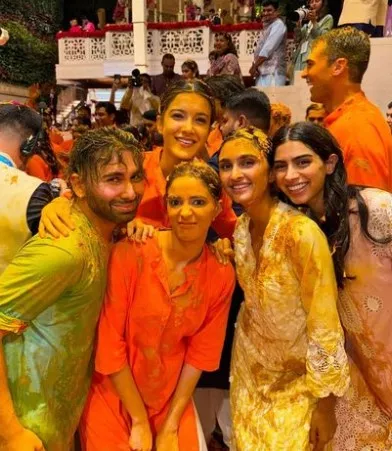 A few moments back, Orhan Awatramani shared a few inside glimpses from Anant Ambani and Radhika Merchant's haldi ceremony. In the first picture, Orhan is seen posing with Khushi Kapoor, Shanaya Kapoor, and Ananya Panday in their traditional avatars, while the other pictures showed all of them smeared in haldi.
