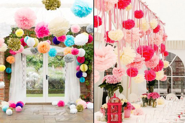 It’s time to give a spin to your wedding theme. The bunch of fluffy playful balls along the seating arrangement (back of the chairs) can create a quick and inexpensive visual display for your party. The cute and colourful pom-poms made out of paper not only offer a playful creation and modern effect to your hall or stage, but also a chic alternative to real flowers and balloons. Pom-poms will make the ambience look magical and fairly-like.