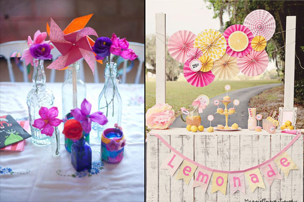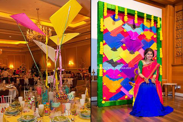 Colourful umbrella at each seating station can make it fun and eye-catching. Big umbrellas in candy colours like pink, orange and green can fill up the entire space with the right spirit and zing. You can quirk up the food stations and drink bar with easy-to-emulate and affordable paper umbrella. You can also keep spare kites for the kids to play with.