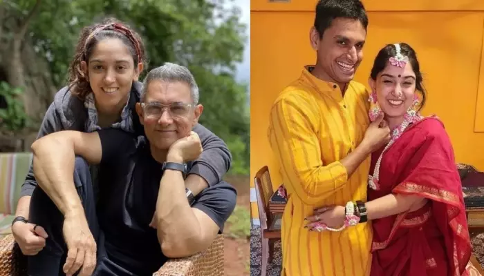 On January 2, 2024, we got hold of some unmissable glimpses from Ira Khan's Haldi ceremony. In several videos that surfaced on the internet, we could see Ira's mom, Reena Dutta, posing with Nupur and his mom. Reena looked beautiful as she was decked up in a green saree and teamed it with a red blouse. Nupur looked handsome in a red kurta. We could also see Kiran Rao, who stunned in a purple nauvari saree. Subtle makeup and gajra-adorned hair added stars to her look.