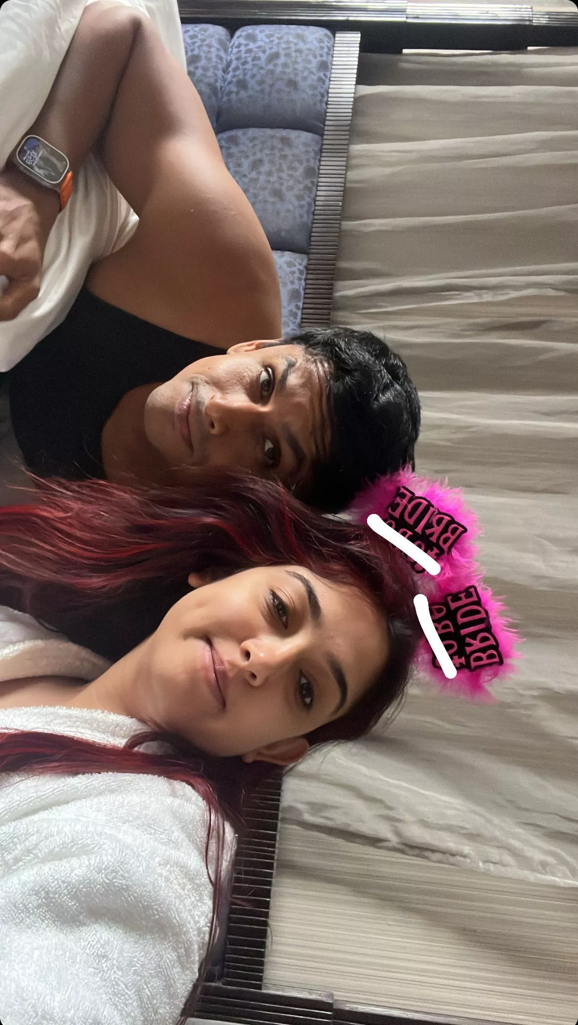 Meanwhile, Ira Khan took to her IG stories and shared a super cute selfie with her husband, Nupur Shikhare. The duo was seen seated on a bed in their comfy outfits while posing for the camera. Nupur was dressed in a black vest while Ira wore a bathrobe. The new bride was also seen donning a headgear with 'Bride' written on it.