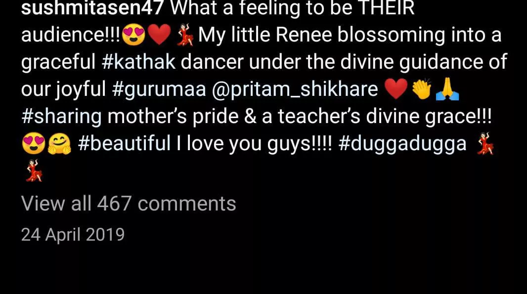 It was back in 2019, when taking to her IG handle, Sushmita Sen dropped a video wherein we could see Renee practising Kathak while Pritam Shikhare was giving her training. In the video, Renee could be seen being decked up in a pink salwar, while Pritam was dolled up in a blue kurta and white pants, which she teamed with a white dupatta. Moreover, the video was enough to speak volumes about the dedication level of both the teacher and the student. Sharing the video, Sushmita penned a gratitude note and expressed her happiness over her daughter performing Kathak under the 'divine grace' of her teacher. Check out Sushmita's heartfelt note below: