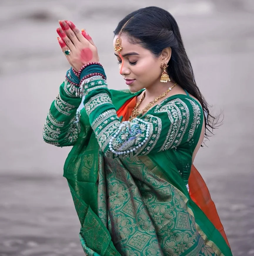 Manisha Rani once again celebrated her Bihari roots by posing in a gorgeous saree on the occasion of Chhath Mahaparv. The dancer shared pictures on her Instagram account, dressed as a bride in a beautiful orange-and-green saree, adorned with traditional jewellery comprising a gold necklace, jhumkas, and maang teeka. Her aalta clad hands looked gorgeous paired with a red and green bangle stack.