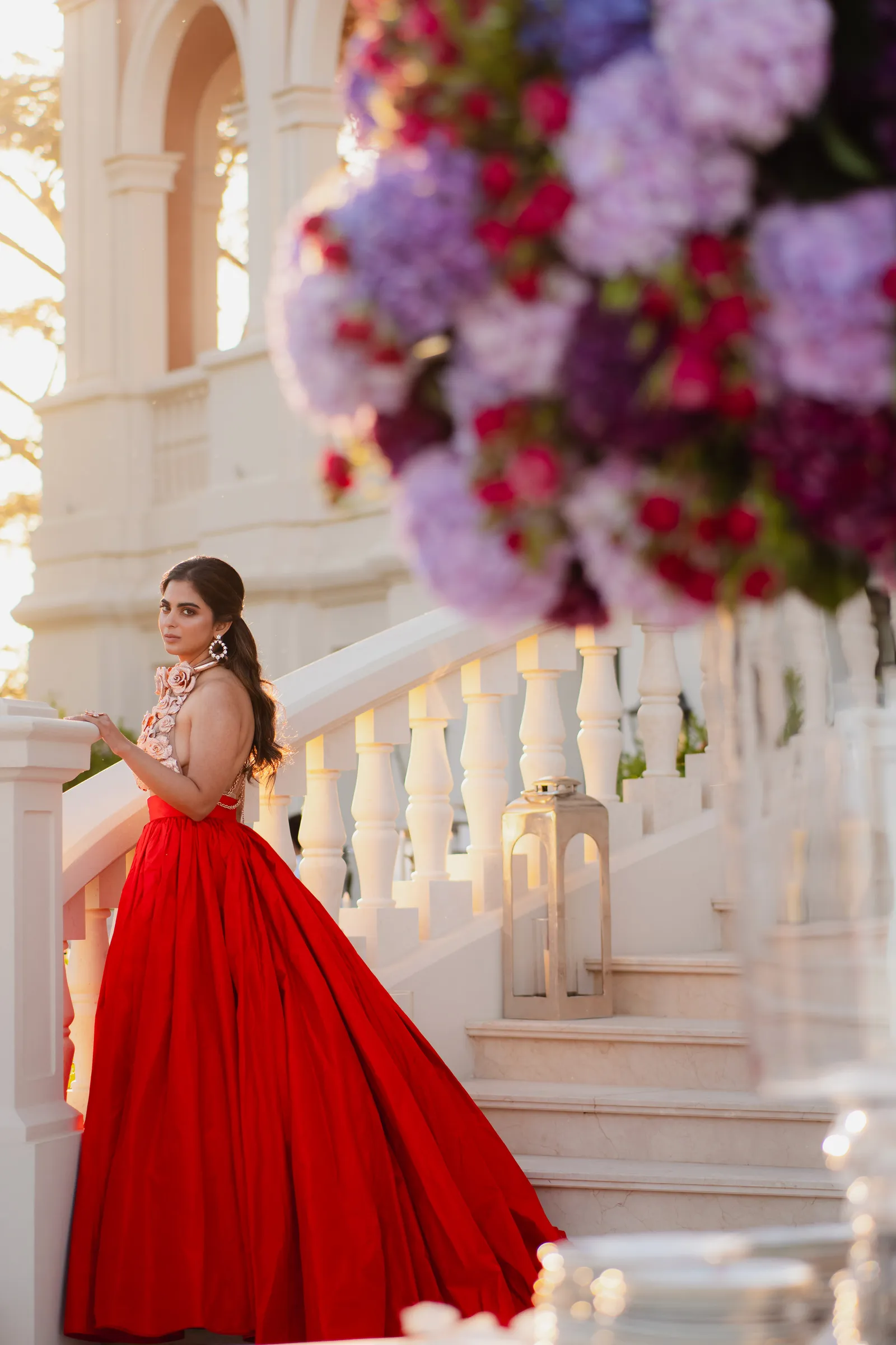 At one of the many events of Anant Ambani and Radhika Merchant's pre-wedding bash, Isha Ambani graced the occasion in a unique backless gown. The gown, adorned with 3D floral patterns on the bodice in a halter neck style and gold neck detailing, was a true fashion statement. The gown then transformed into a flowing red ballgown, adding a touch of elegance to Isha's look. She complemented her ensemble with diamond hoop earrings, rings, body chains, and a half-up-half-down hairdo, showcasing her individual style and fashion sense.