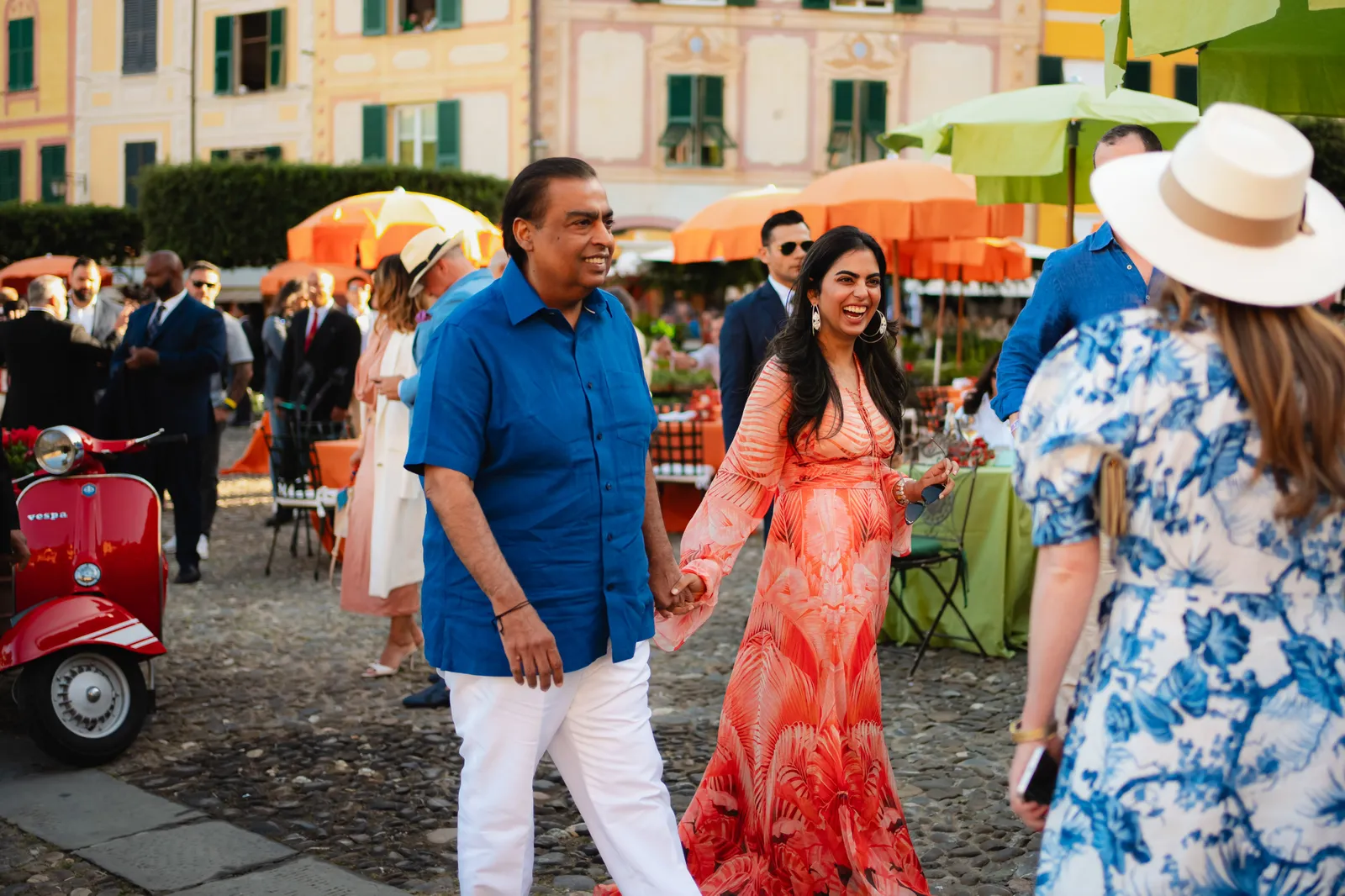In yet another glimpse, we saw Mukesh Ambani holding his daughter, Isha’s hand. The father-daughter duo walked on the port and talked to the guests. In the picture, the businessman donned a crisp blue shirt, which he paired with a pair of white trousers. Isha, on the other hand, donned an easy-breezy orange, white, and red-hued long gown.