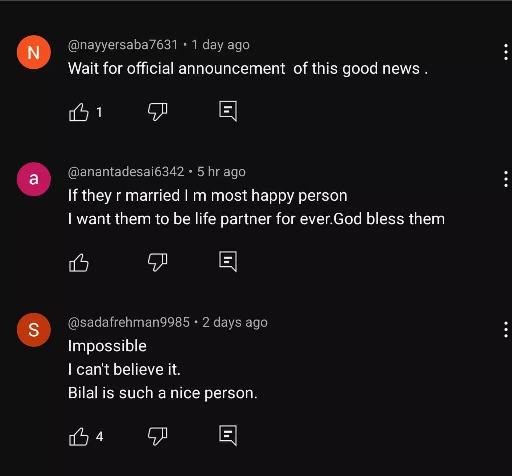 Soon after the video was released, people took to the comment section of the YouTube video and penned down their thoughts on the same. A user said, “Bilal Abbas and Dur-e-Fishan are both beautiful people and my favourite actors. I would be very happy for them if it is true and if it's not, I hope they do get married.” Another fan wrote, “Wait for the official announcement of this good news” A third netizen mentioned, “I want them to be life partner forever. God bless them.”