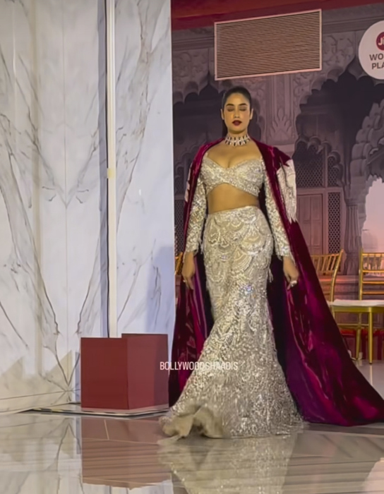 Janhvi styled her outfit with a matching sultry blouse that featured a plunging neckline. The actress completed her look with a maroon-hued embroidered cape. She accentuated her look with a statement ruby encrusted-diamond necklace, bold lipstick, blushed cheeks, highlighted cheekbones and a sleek ponytail.