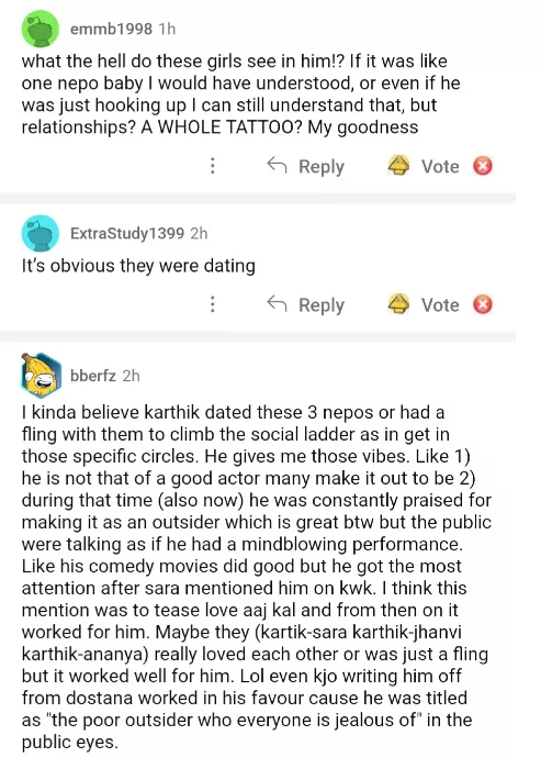 Soon after the Reddit user dropped the pictures, netizens flooded the comment section with their reactions. While one of the social media users commented, "JK literally got a tattoo on herself with his initials what delulu land are people living in," another one wrote, "what the hell do these girls see in him!? If it was like one nepo baby I would have understood, or even if he was just hooking up I can still understand that, but relationships? A WHOLe TATTOO? My goodness." One more internet user reacted to the pictures and wrote, "Sara was right. He's everyone's ex." Another comment can be read as "Justice for Shikhar!!!Janhvi should get tattoo for Shikhar too."