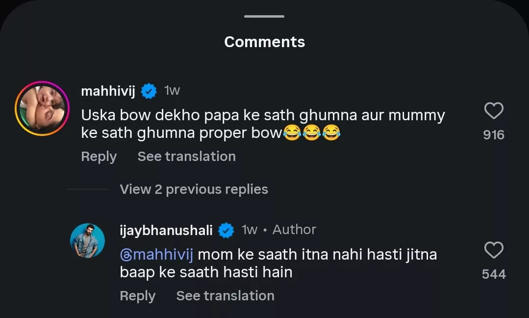 The video featured Jay and Tara running across the Shibuya crossing hand in hand. Mahhi jumped into the comments on the adorable video, sparking a playful exchange of jabs between her and Jay. She wrote, "Uska bow dekho papa ke sath ghumna aur mummy ke sath ghumna proper bow." Jay replied, "@mahhivij mom ke saath itna nahi hasti jitna baap ke saath hasti hain." Mahhi pointed at Tara's crooked hair bow, hinting that she decks up their daughter better. Jay reverted by saying that Tara has more fun and laughs more with her dad than with her mom.