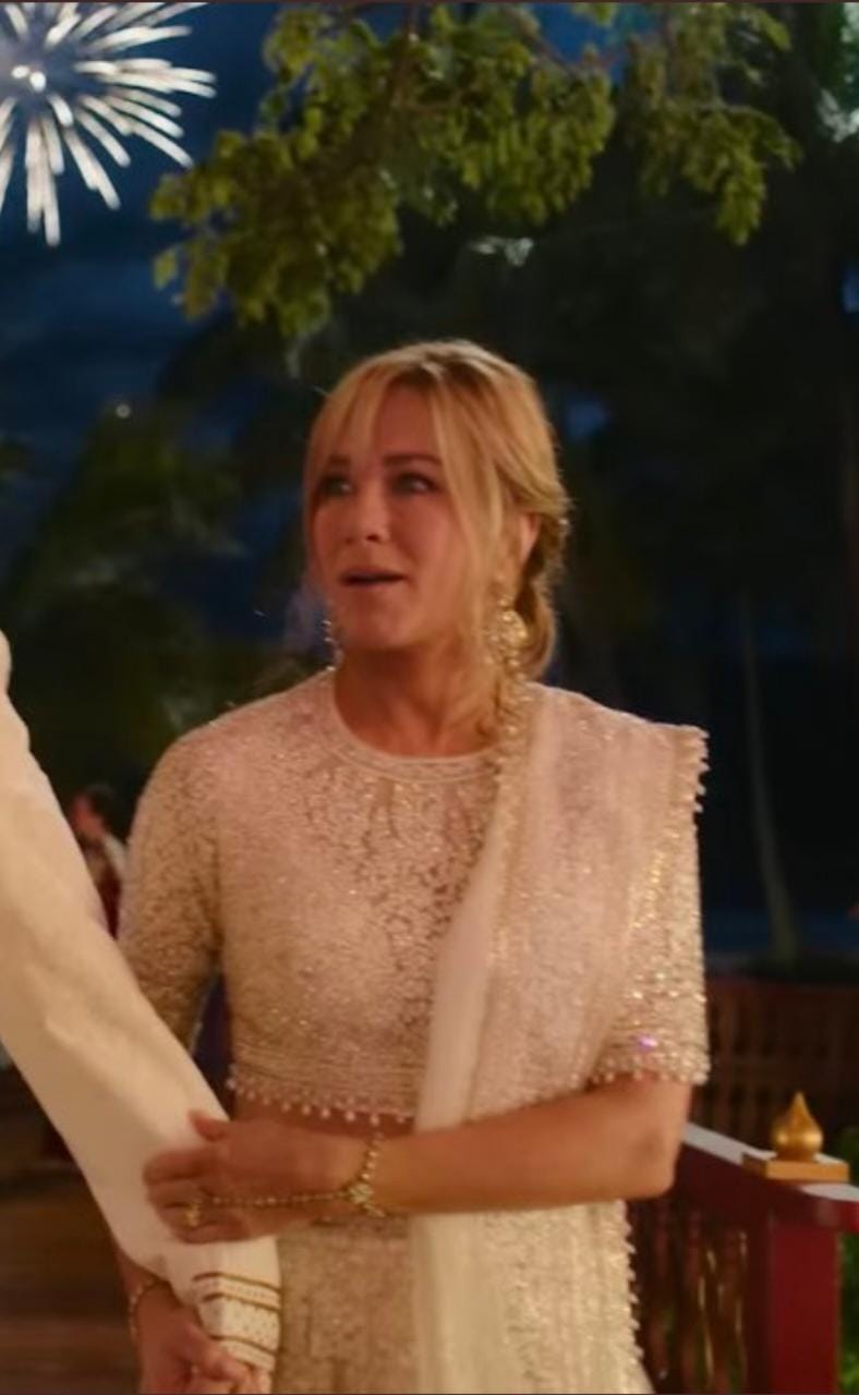 On January 30, 2023, one of Jennifer Aniston's fans took to their Twitter handle and shared two snippets from her upcoming Netflix movie, Murder Mystery 2's trailer, which was also launched yesterday. In the snippets, we can spot the gorgeous actress in an ivory-hued heavily embellished lehenga from the ace designer, Manish Malhotra's collection. She teamed her look with a matching choli and a dupatta. Dewy makeup, a messy bun, statement earrings and haath phools completed her look. Check out: