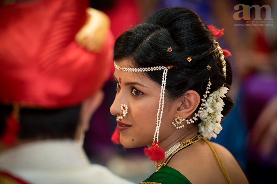 The bride ties her hair into a neat, round bun (ambada) and embellishes it with traditional hair jewels called khopa or bejewelled pins, followed by jasmine gajras.