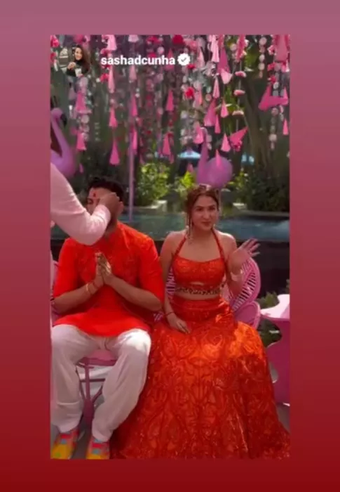 On the other hand, Malvika's soon-to-be husband, Pranav, twinned with her in a matching-hued outfit. He donned a plain orange-hued kurta. Pranav styled it with an embellished jacket and white pyjama. The groom-to-be completed his look with a pair of quirky sneakers.