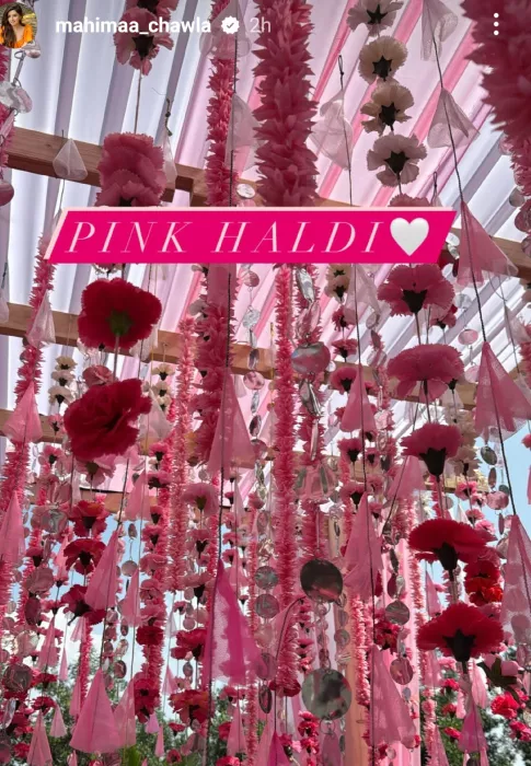 Malvika Raaj's haldi decoration simply swooned away everyone's hearts. The actress opted for a day haldi ceremony near a pool. A beautiful mandap was built, which was decorated with pink-hued flowy clothes, flowers, mirrors and tassels. Moreover, in the glimpses from the haldi ceremony, Malvika and Pranav can be seen sitting on pink-hued chairs adorned with quirky cushions.