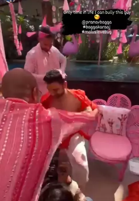 In another glimpse from Malvika and Pranav's haldi ceremony, the lovebirds can be seen putting haldi on each other's faces. In the next picture, we can see the duo getting showered with flowers, and oh boy, they looked like a match made in heaven. In a video from their haldi ceremony, the boys' gang can be seen tearing down the groom-to-be, Pranav's clothes.