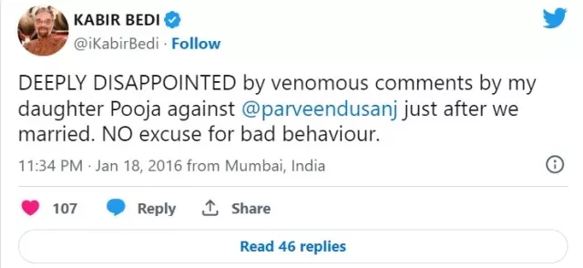 “DEEPLY DISAPPOINTED by venomous comments by my daughter Pooja against @parveendusanj just after we married. NO excuse for bad behaviour."